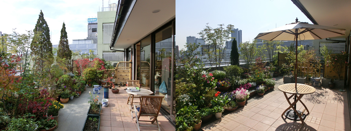 After:十数年前にされた屋上庭園のリフォームです。洋風・和風庭園が有り、洋風庭園は天然木のラティスフェンス・アーチを塩ビに替え、色も白に替え清潔感を出し、タイルデッキは