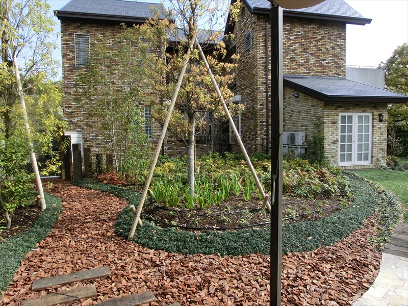 After:新築から少し年月の経過したお客様でお庭の除草にたいへん苦労されていました。 当初数本の落葉樹が植わっており、その樹木の他に常緑樹等、数種類の樹木を植えバランスのとれた