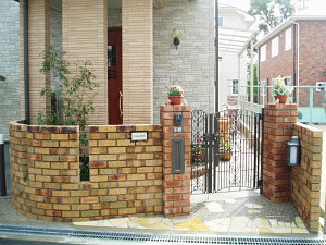 建物に合った柔らかなエクステリアで、門柱(レンガ・ガラスブロック使用)や鋳物フェンスなど曲線を生かし、