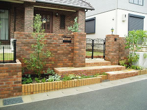 レンガ仕様で門・塀廻りの高級感が出ました。塀、アプローチ、花壇のレンガを使い分けしました。